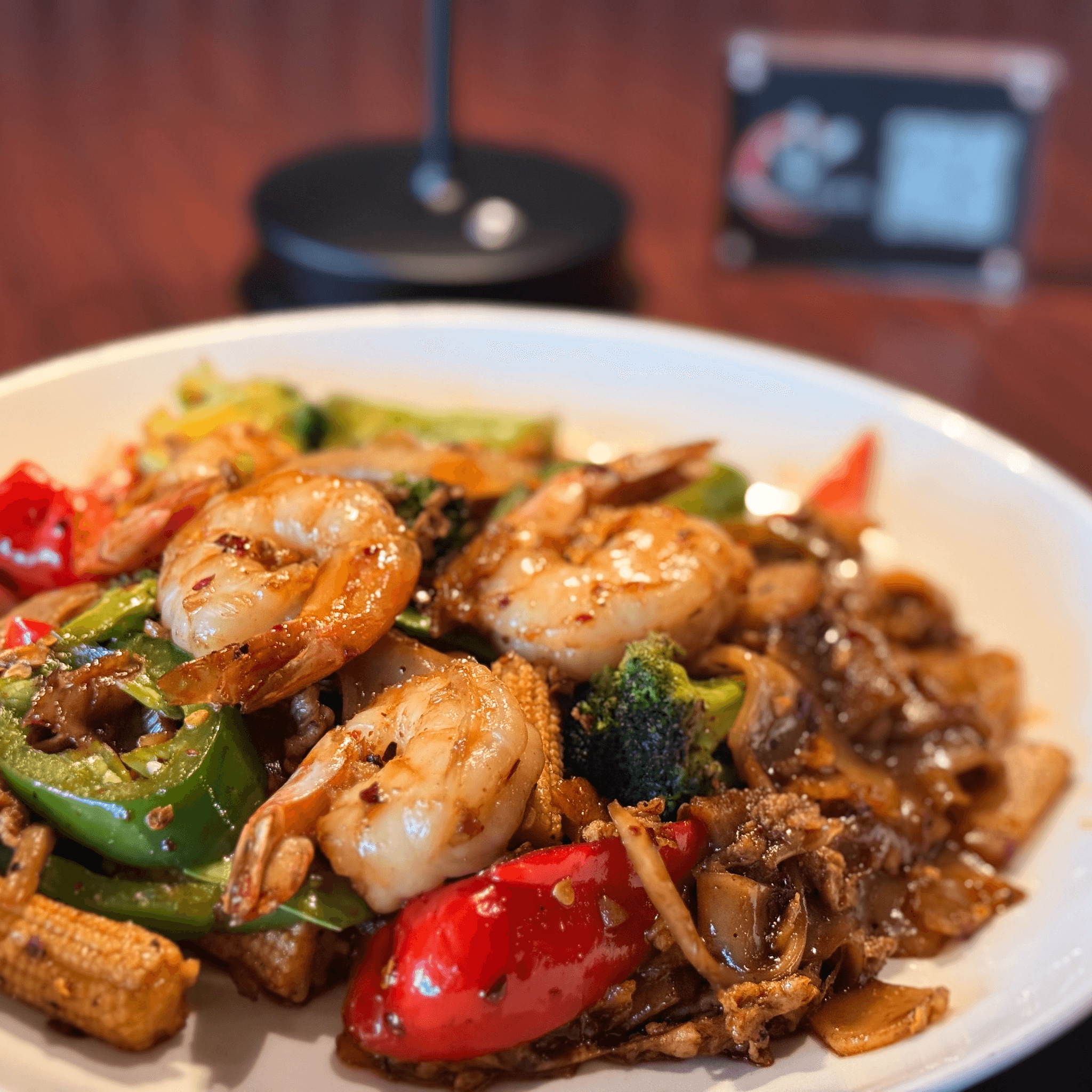Stir-fried big flat rice noodles with egg, bell pepper and, hot pepper, bamboo shoot, broccoli, carrot, pea-pod, onion, and sweet basil