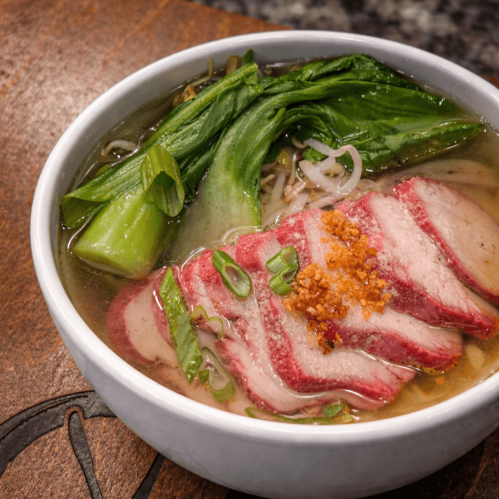 Thai-style mild soup, thin-sliced BBQ pork, egg noodles, baby bok choy, bean sprouts, and green onion