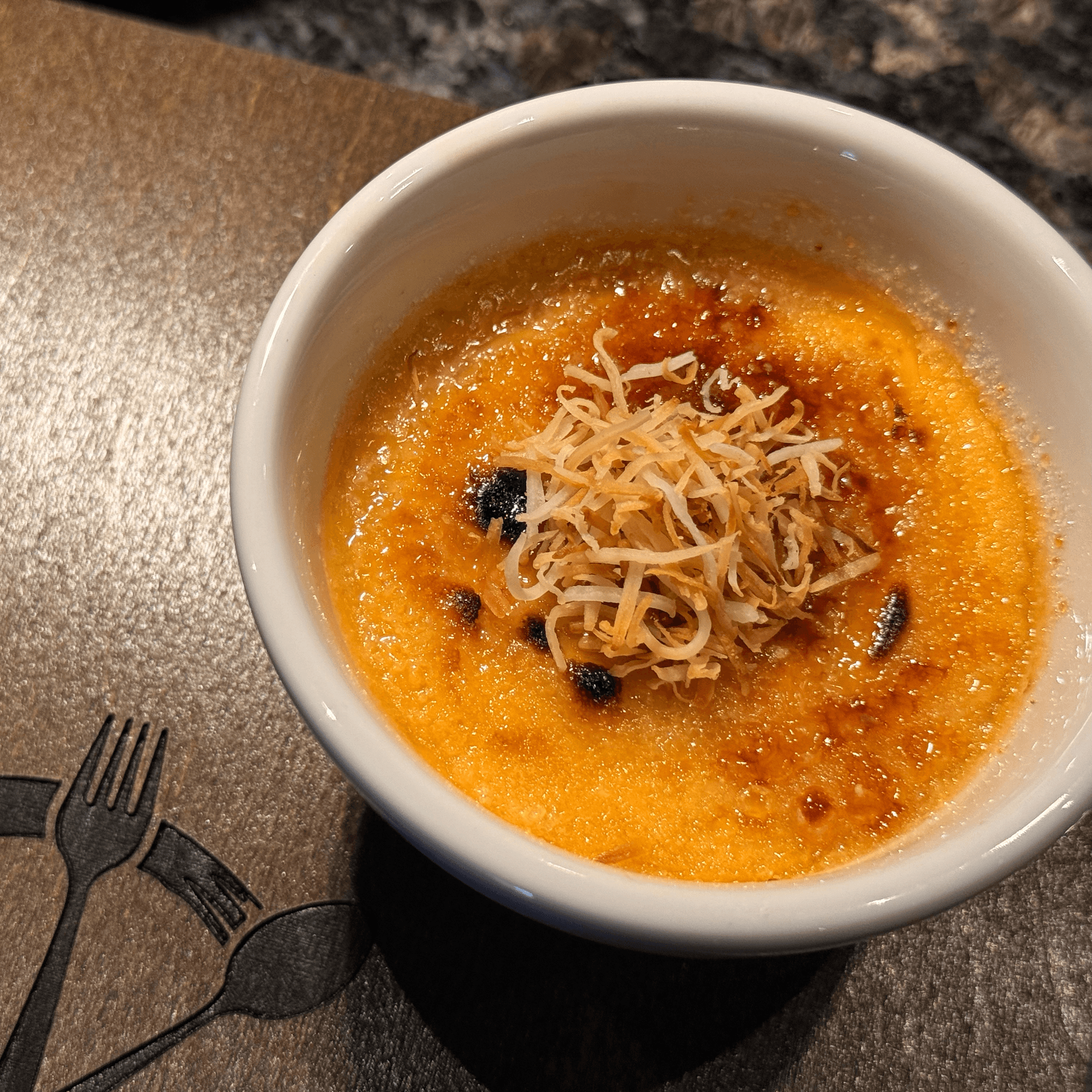 A silky Thai tea - infused custard baked to perfection and finished with a caramelized sugar crust. Topped with organic roasted coconut flakes for a delicate crunch and subtle tropical aroma