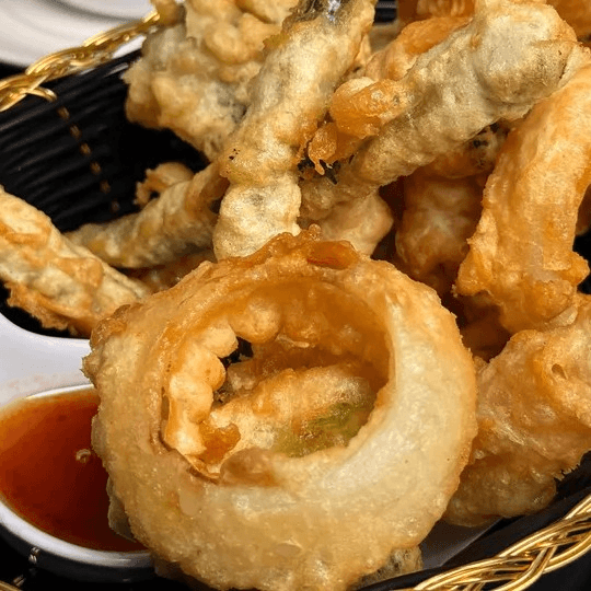 Onion rings, kabocha squash, green beans, and zucchini in tempura batter