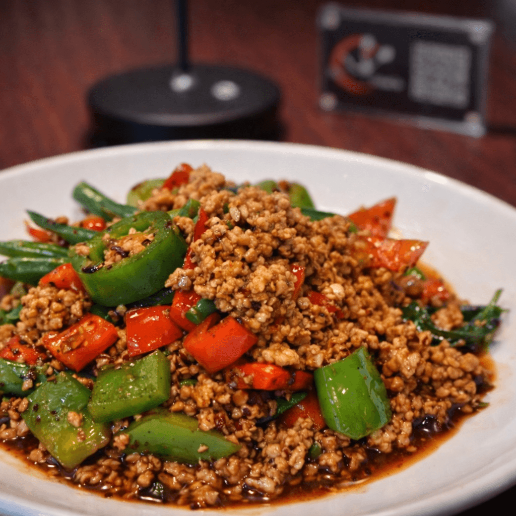 Stir-fried crushed garlic, chili pepper, green beans, diced bell peppers, and sweet basil leaves