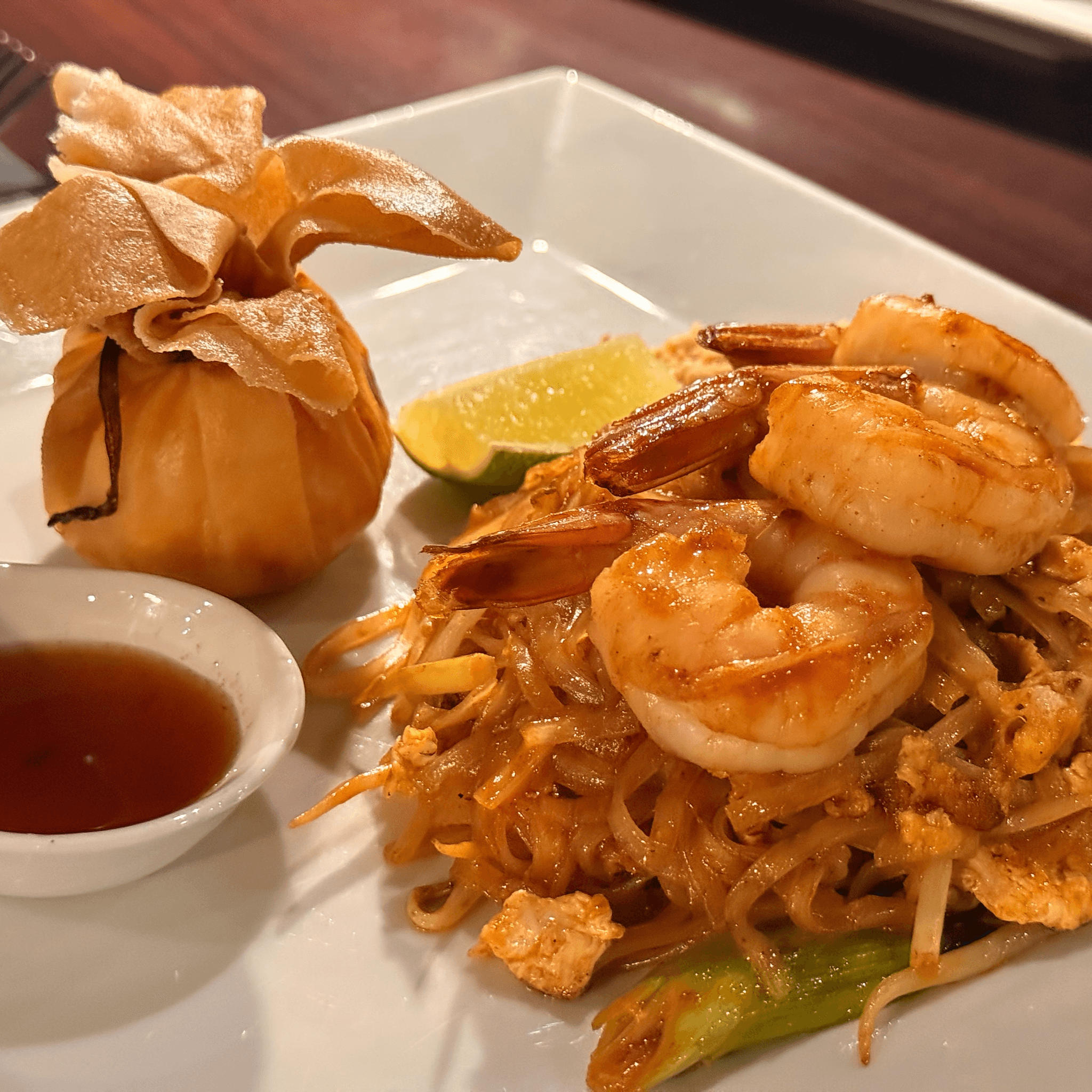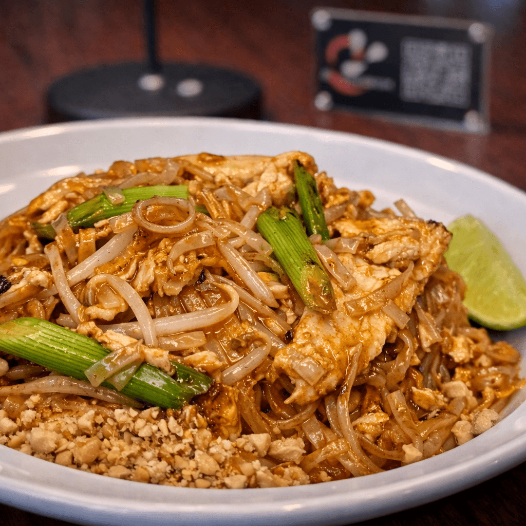 Thai thin rice noodles with egg, bean sprouts, onions, tofu, crushed peanuts, stir-fried with signature Pad Thai sauce