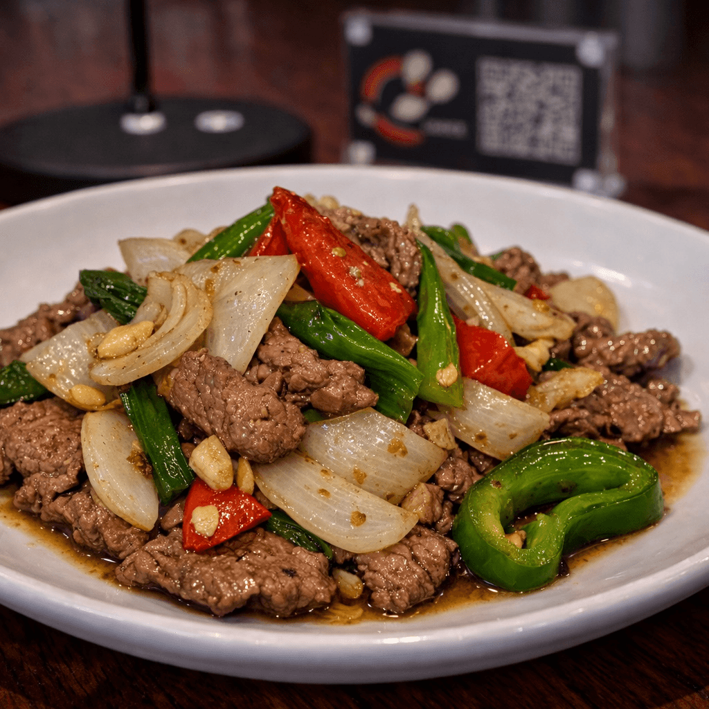 Sautéed, your choice of meat with fresh garlic, onions, and peppers, in Thai garlic sauce