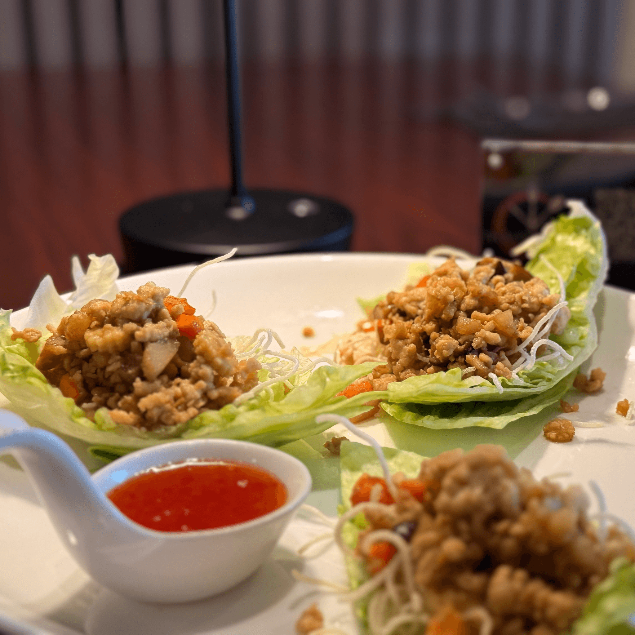 Minced chicken or tofu, shitake mushrooms, water chestnuts, carrot, baby corn, topped on crispy noodles. Served with fresh lettuce and sweet chili sauce