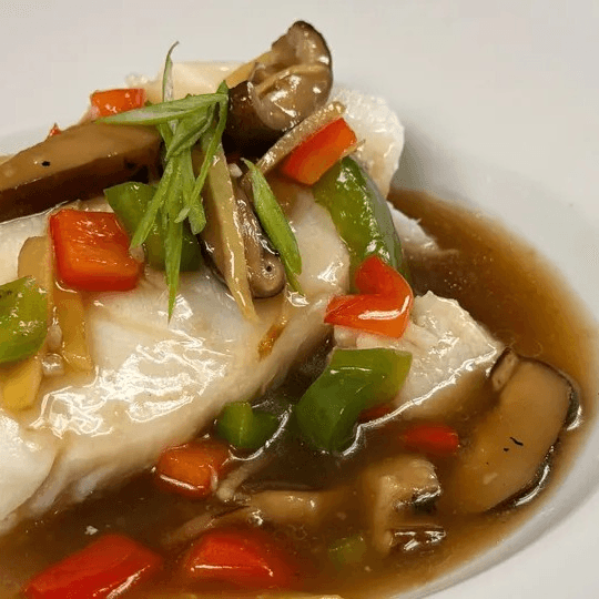 A mignon of Chilean sea bass steamed with house ginger sauce and selected black shitake mushrooms. Very delicate and tender. Served with jasmine rice
