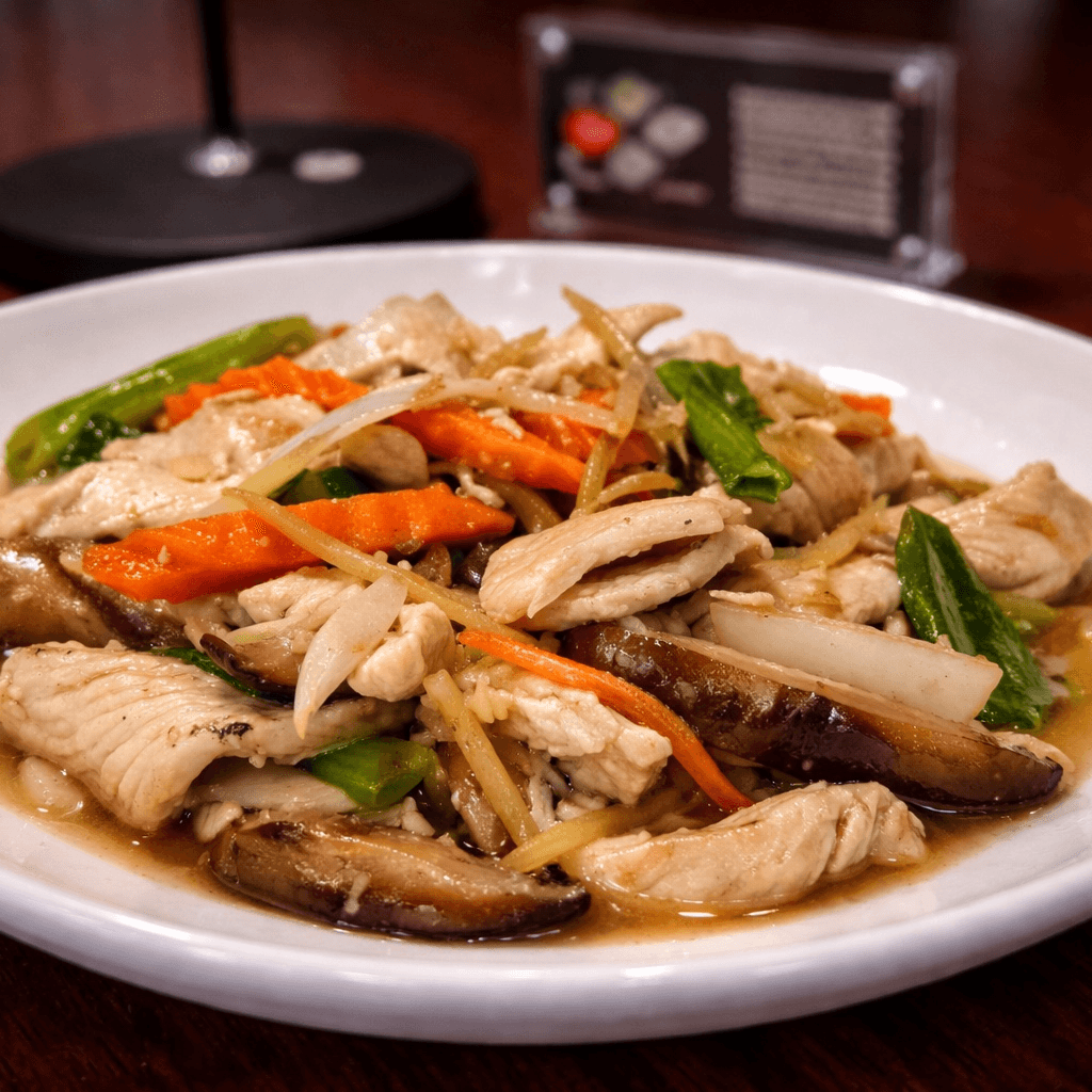 Stir-fried onions, shiitake mushrooms, carrot, and sliced ginger in our homemade ginger sauce