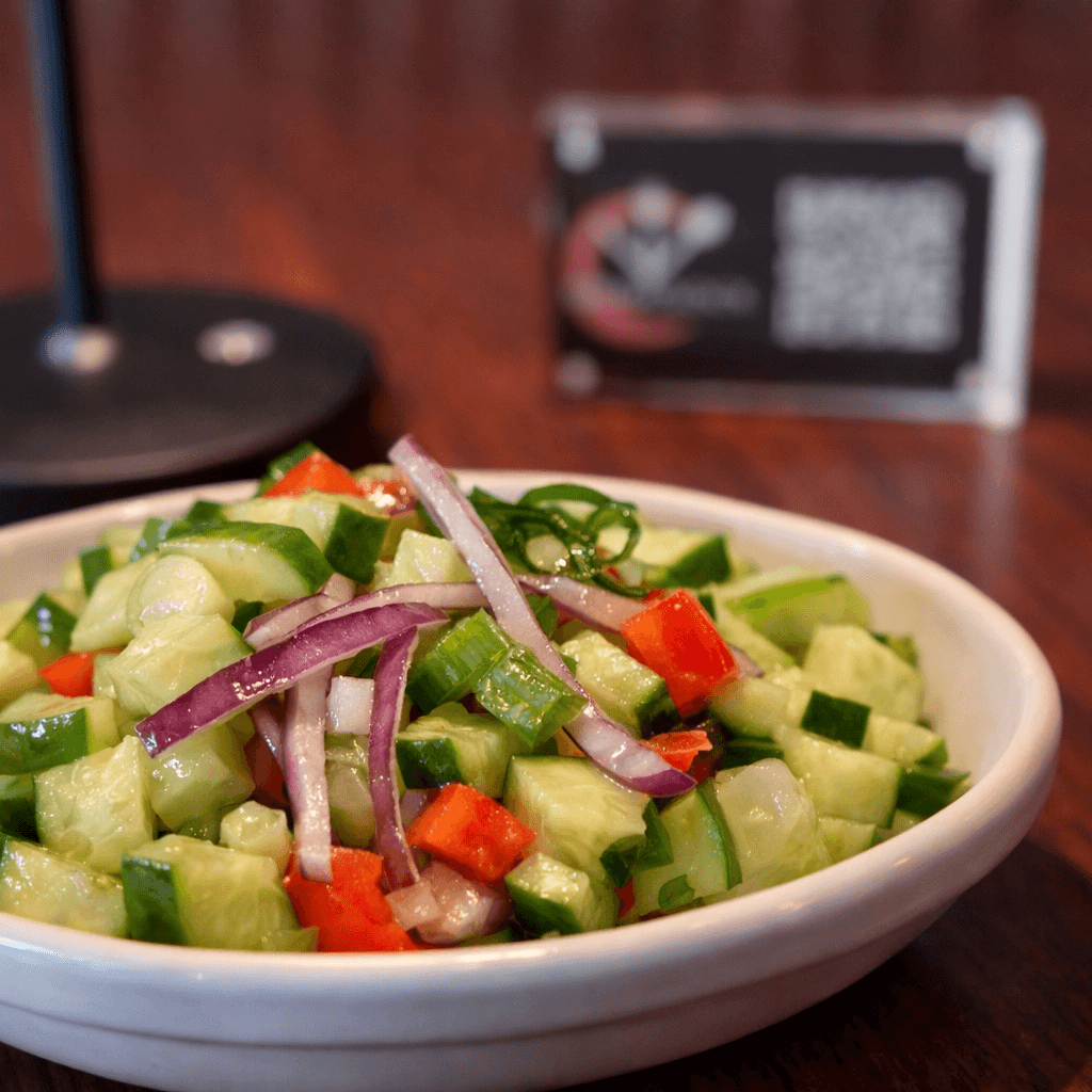 Freshly sliced cucumbers topped with onions and diced bell peppers