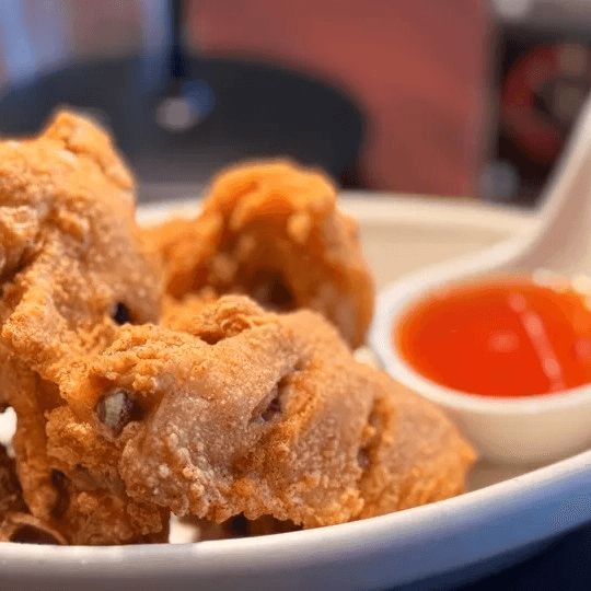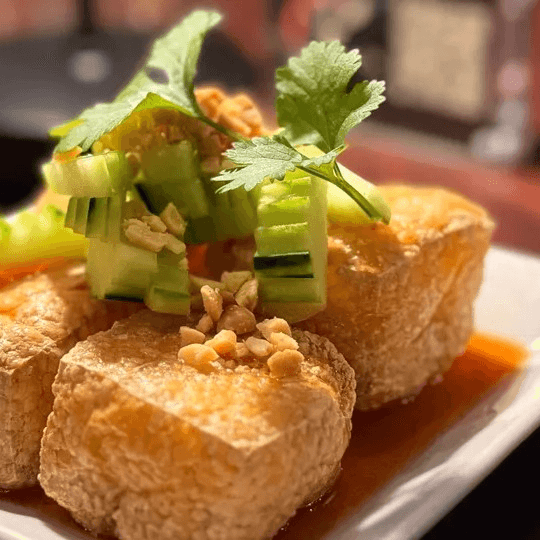 Fried soft pillow tofu served with spicy, sweet, and sour sauce