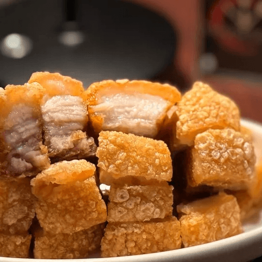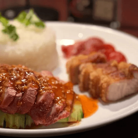 Another classic Thai street food, a selection of marinated pork tenderloin, cut into thin slices. Served with jasmine rice, fresh cucumber, crispy pork belly, Chinese sausage, cilantro, and topped with homemade BBQ pork sauce