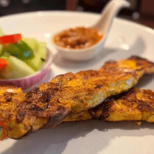 Contains nuts. Grilled marinated chicken served with our own delicious peanut sauce and cucumber salad
