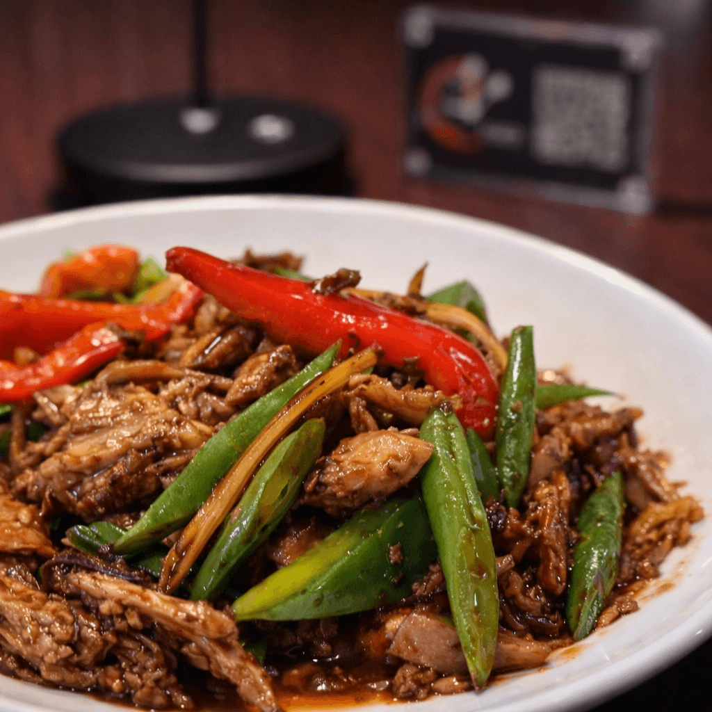 Sliced duck meat stir-fried with bamboo, string beans and hot peppers, red pepper, green pepper