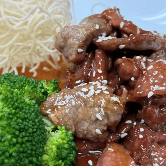Sliced flank meat marinated with soy sauce and pure honey, topped with sesame seed garnish