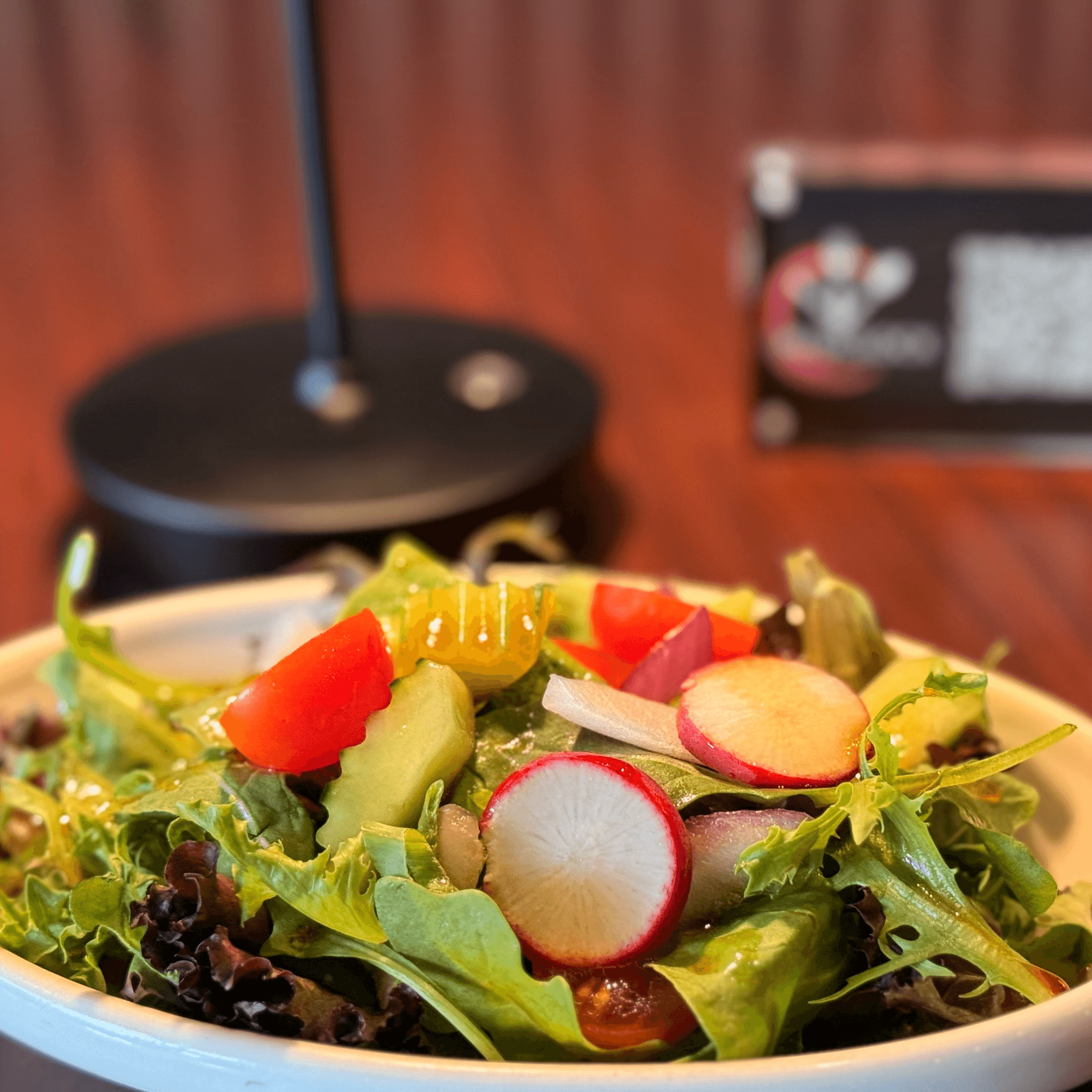 Green spring mixed top with red radish, daikon, cherry tomatoes, dice cucumbers, green onion, served with house sesame vinaigrette