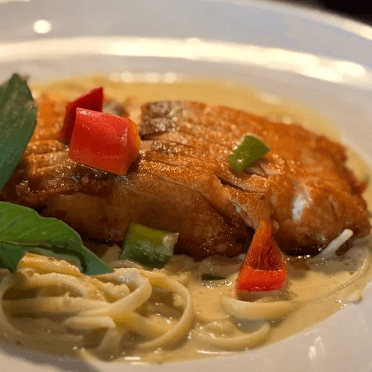Pan-fried salmon in green curry sauce, eggplant, topped with linguine pasta