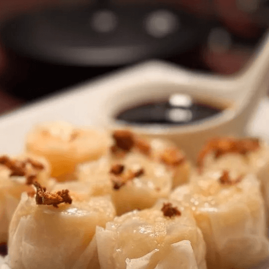 Steamed shrimp dumpling served with sweet brown sauce