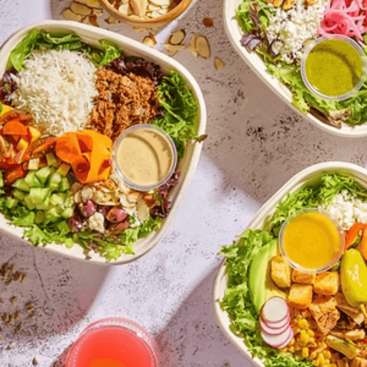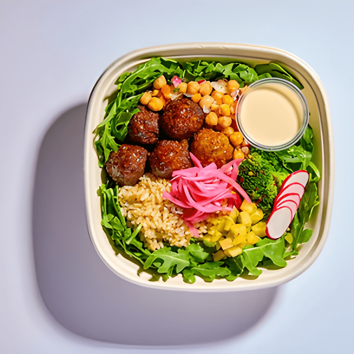 Arugula, brown rice, curry lamb, pickled onion, chickpea pico, spicy broccoli, apple celery tajin, honey nut feta, radish, cashew, and confit garlic tahini.