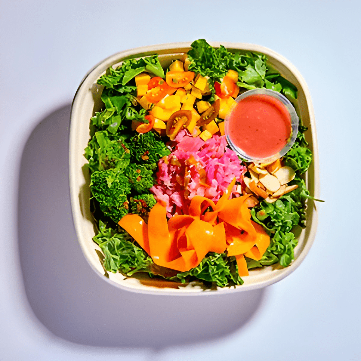 Kale, tomato, peach, thyme, Vitasana cabbage slaw, spicy broccoli, carrots, orange, pomegranate, almonds, raspberry vinaigrette dressing.