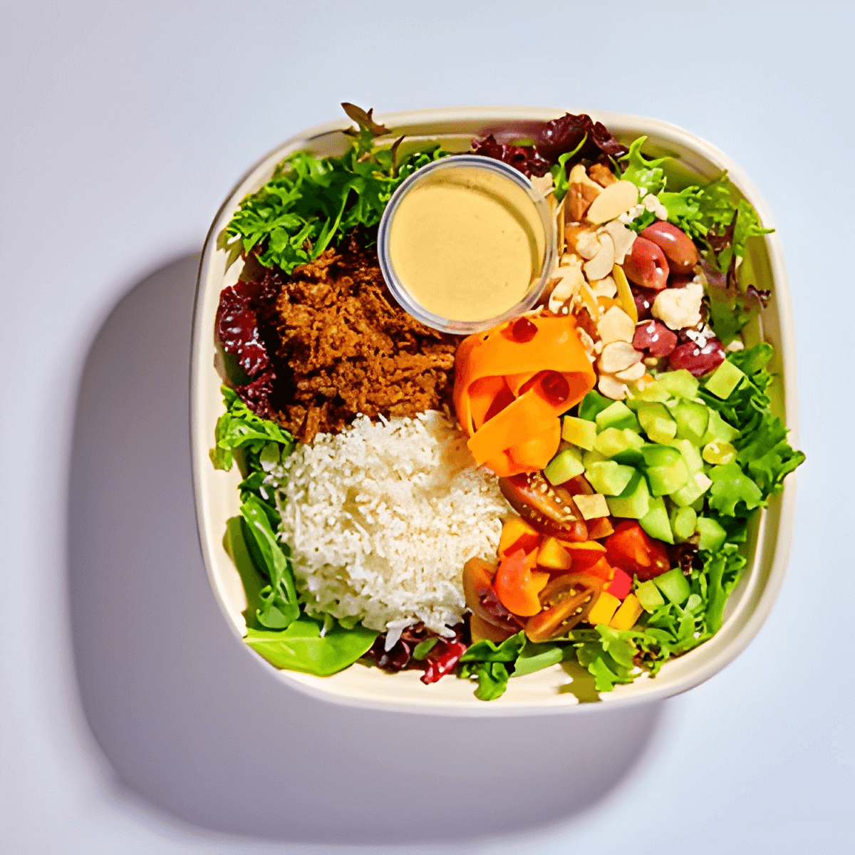 Spring mix, white rice, Persian brisket, eggplant cream, tomato peach thyme, cucumber lemon mint, kalamata feta cheese, carrots, orange, pomegranate, almonds, sumac sauce.