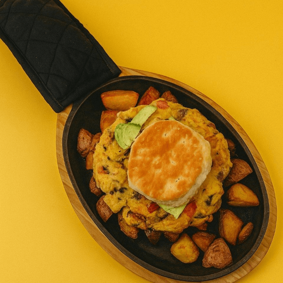 A hearty skillet with yellow potatoes, fresh avocado, mushrooms, peppers, onions, and tomatoes, topped with two eggs any style and served with a warm, homemade biscuit.