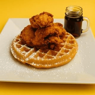 Crispy golden fried chicken served on a fluffy Belgian waffle, topped with powdered sugar and a side of warm maple syrup.