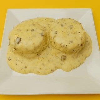 Two biscuits covered in our homemade Jones Farm sausage gravy.