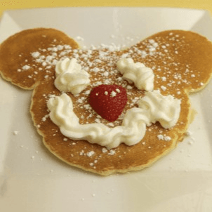 Mickey Mouse shaped pancake. Topped with powdered sugar and whip cream.