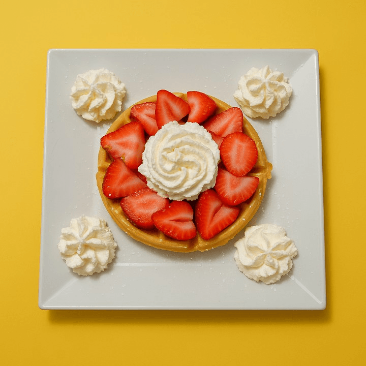 Fluffy Belgian waffle filled and topped with juicy blueberries, finished with whipped cream and a sprinkle of powdered sugar.