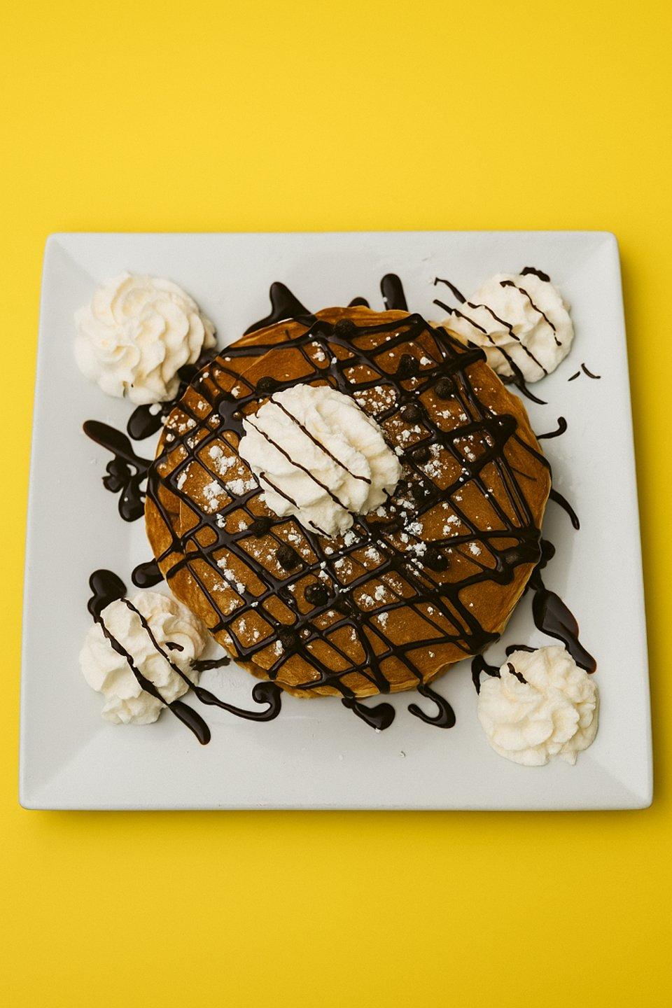 Homemade pancakes filled with chocolate chips topped with powdered sugar, chocolate sauce, and whipped cream.