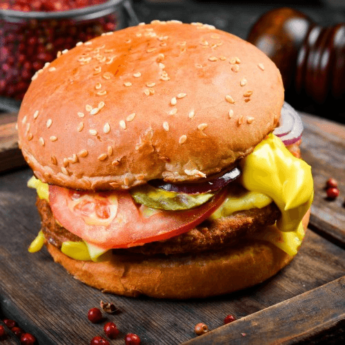 A juicy beef patty topped with melted cheese, tangy tzatziki sauce, and fresh lettuce, all sandwiched in a sesame seed bun