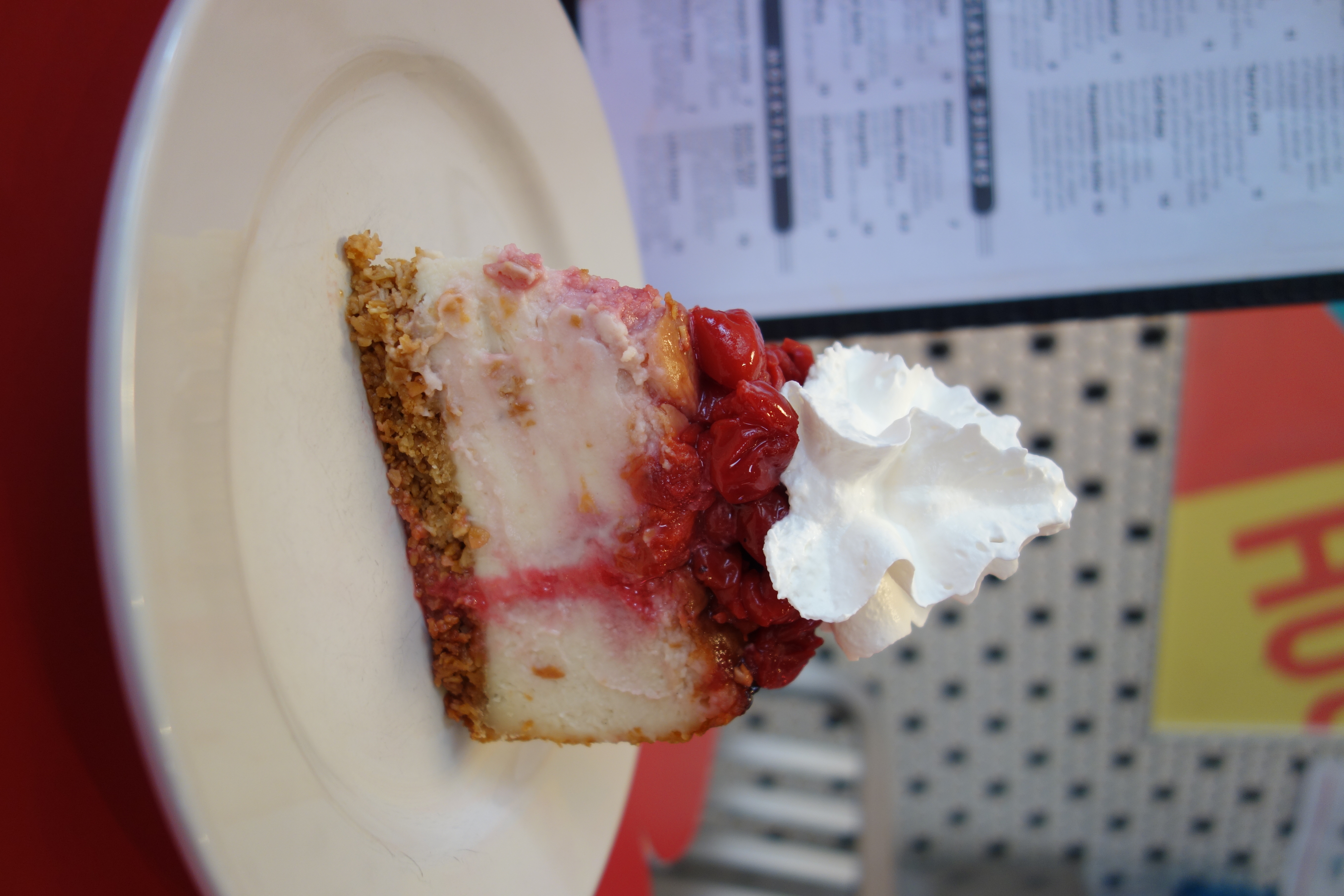 A true classic, creamy cherry-swirled vanilla cheesecake with a tart cherry topping, granola crust, & whipped topping. GF