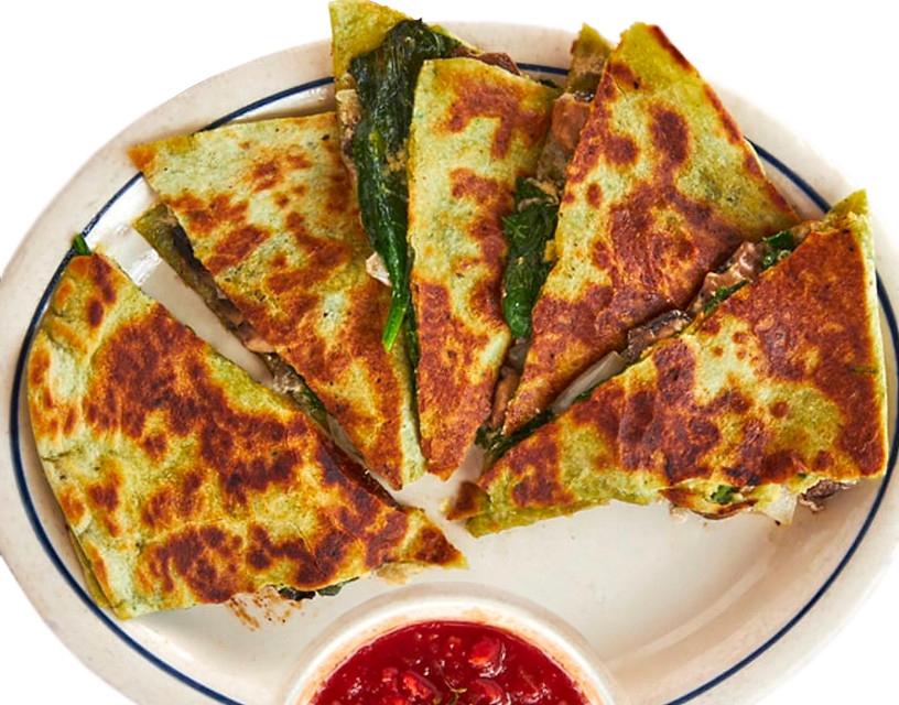 Sautéed spinach with grilled onions and mushrooms, our house soy cheese spread on a tortilla spinach wrap, served with fresh salsa