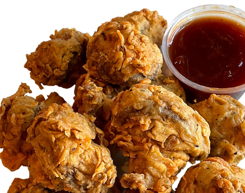 Organic mushrooms deep-fried in flour batter, served with BBQ sauce