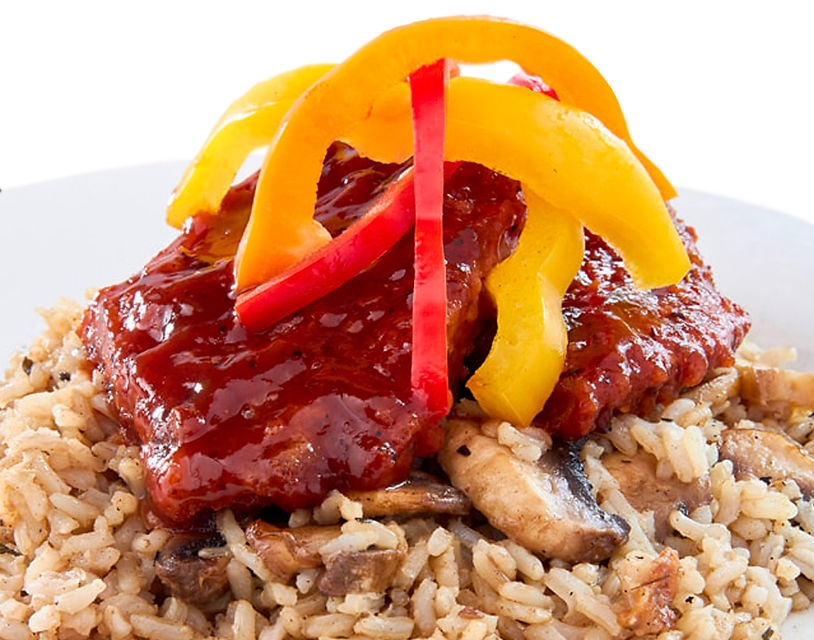 Two pieces of battered steak tossed in jerk BBQ sauce served over a bed of rice with sautéed onions and red and yellow peppers