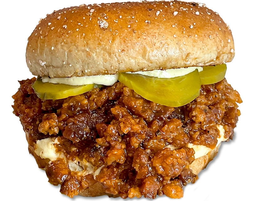 Seitan ground to a crumble and seasoned and tossed in BBQ sauce on the grill served on a toasted bun with soy cheese, pickles and more BBQ sauce