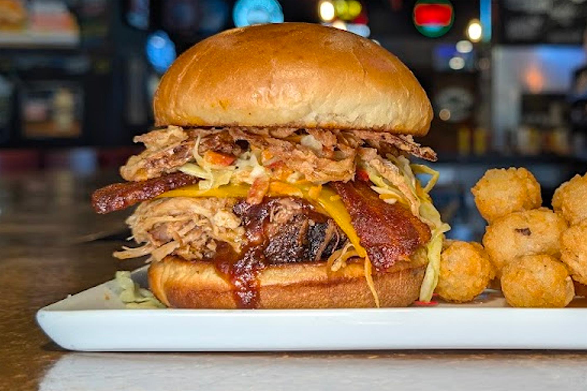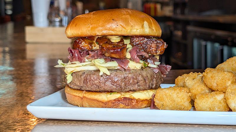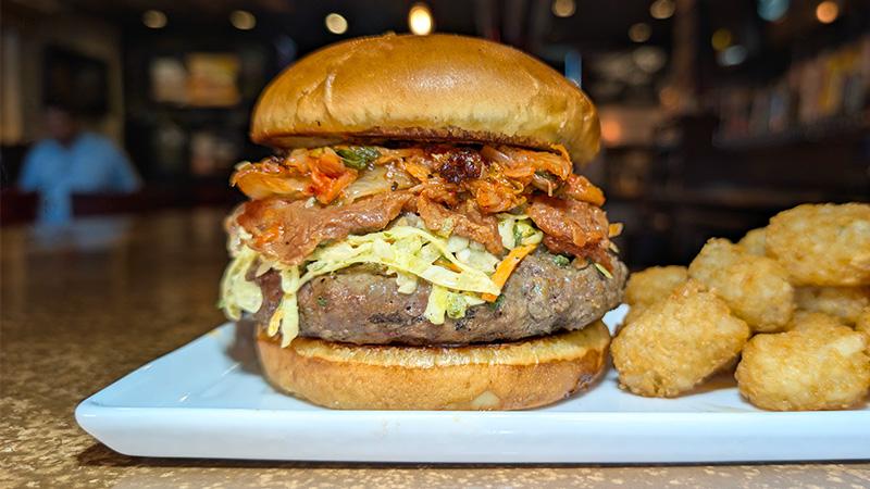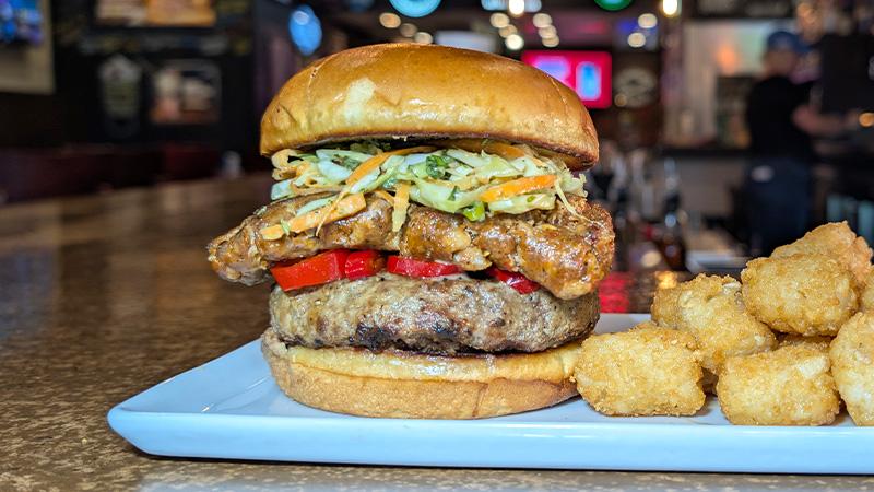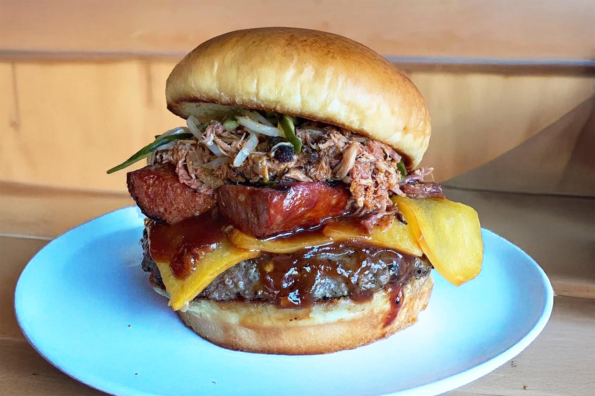 FOOD PARADISE FEATURED BURGER | spice rubbed prime patty, smoked pulled pork, grilled andouille sausage, smoked cheddar, cucumber onion slaw + habanero bbq glaze