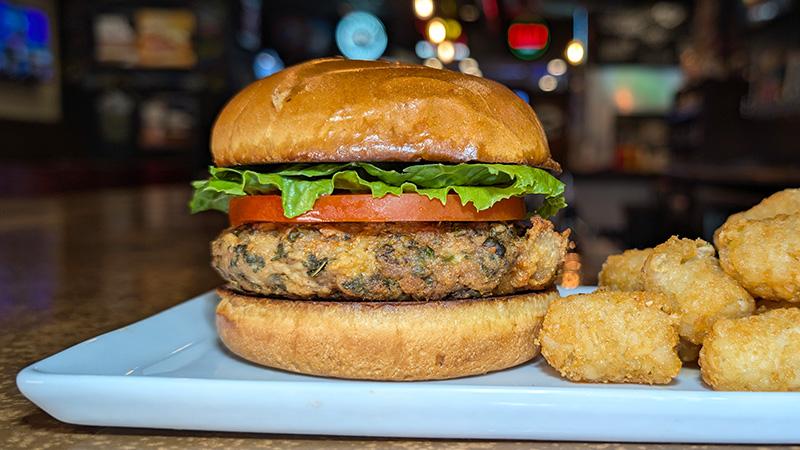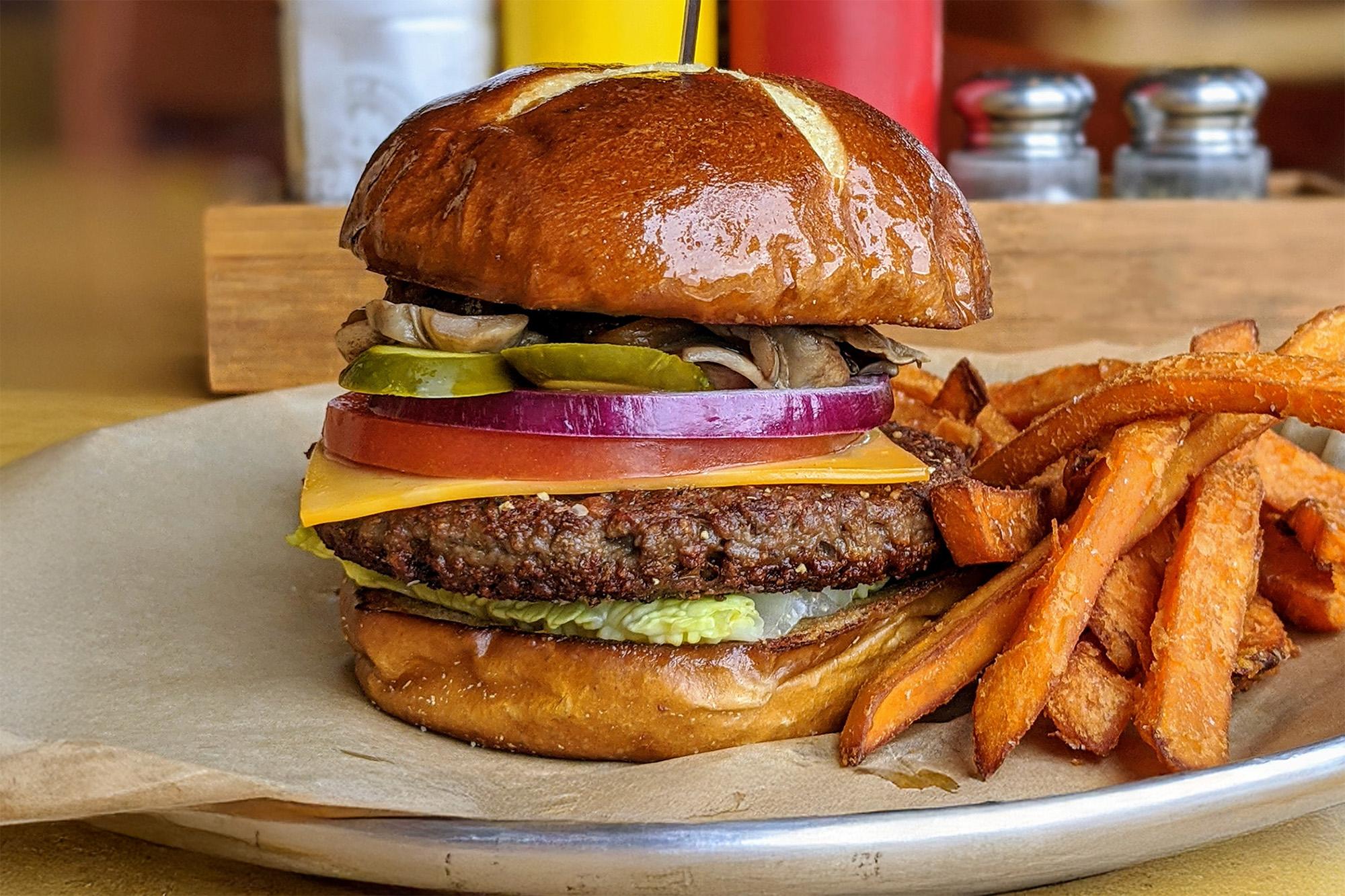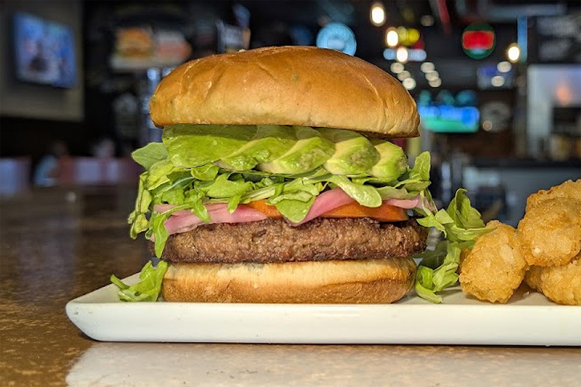 impossible plant-based patty, pickled red onions, arugula, tomato, avocado on a toasted brioche bun