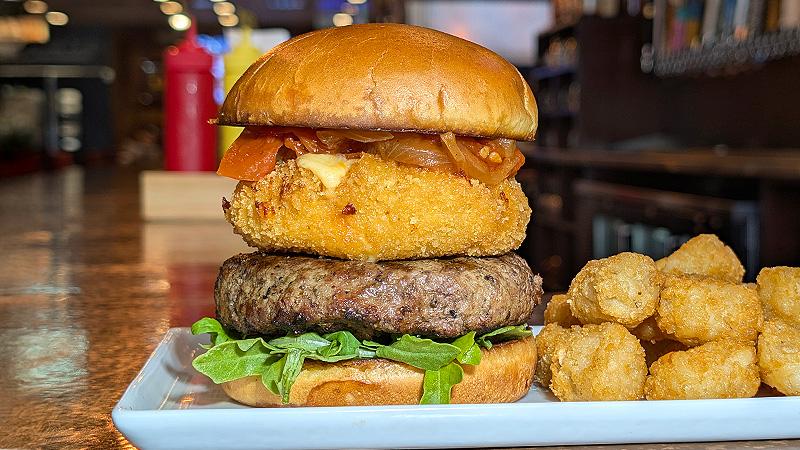 prime beef patty stacked with a crispy gooey smoked gouda frisco, arugula & tomato chutney on a toasted brioche bun