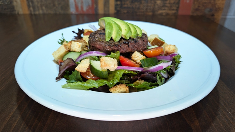 mixed greens, avocado, red onions, grape tomatoes, carrots, cucumbers, brioche croutons, topped off with your choice of our signature prime beef patty* or a chicken patty