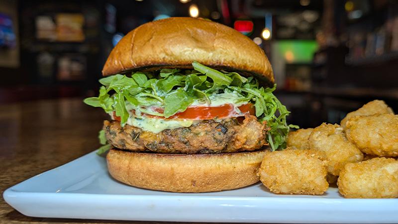 RANKED NATIONALLY TOP-20 VEGGIE BURGERS | our powerhouse veggie patty, baby arugula, avocado, goat cheese, tomato, chipotle aioli on a toasted whole wheat bun. NOT GLUTEN FREE