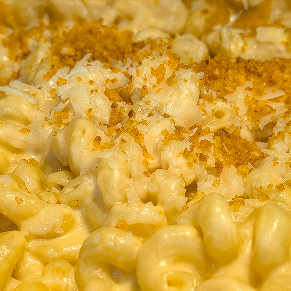 cavatappi with our special cheddar, parmesan & smoked gouda blend topped off with our housemade migas