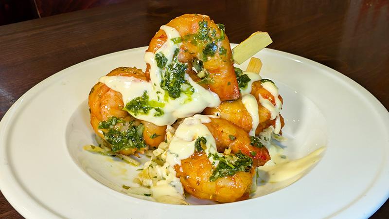 two smoked shrimp skewers with scallion chimichurri, jicama slaw, roasted garlic parmesan truffle aioli