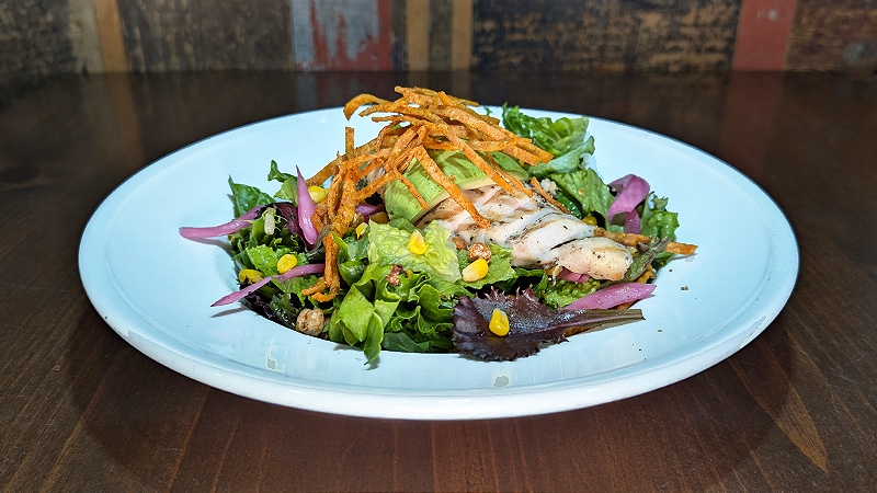 mixed greens, grilled chicken, grilled corn, avocado, grape tomatoes, crispy ceci beans, pickled red onions, spicy tortillas, tossed with jalapeno-cilantro vinaigrette