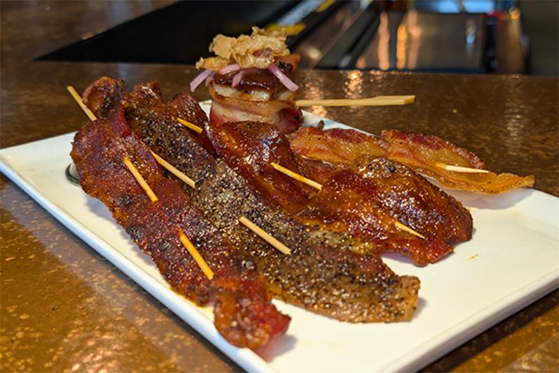 one skewer each of our braised pork belly, hickory smoked bacon, en fuego bacon, candied bacon & peppered bacon