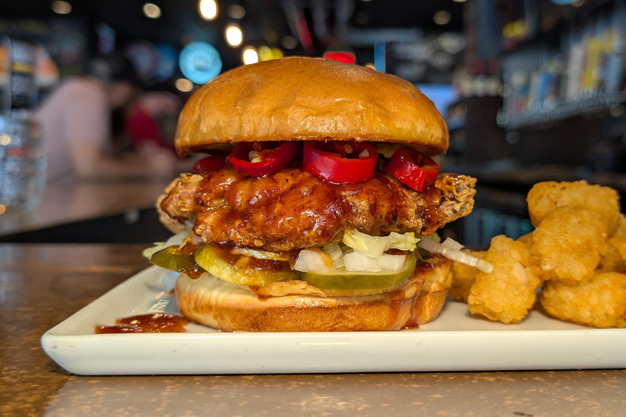 boneless chicken thigh tossed in our seasoned flour and fried crispy, topped with shredded romaine lettuce, diced white onions, dill pickles, pickled Fresno chilis, chipotle honey glaze