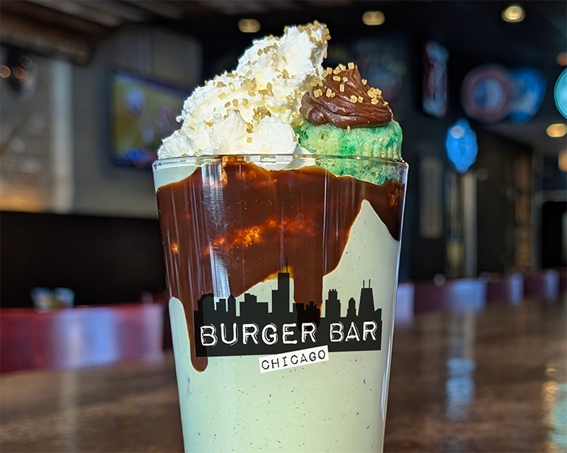 Homers mint chocolate chip ice cream, double chunk chocolate brownie, vanilla whipped cream, chocolate grenache cupcake. Make iI boozy with a shot of Jameson Irish Whiskey...