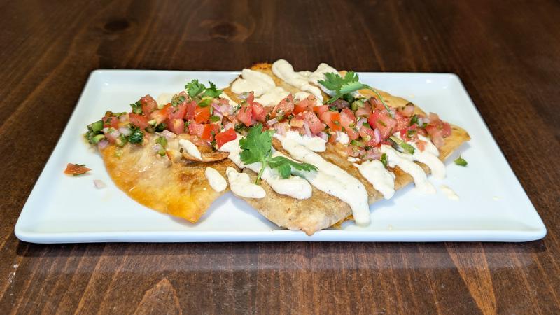 two flour tortillas filled with argentinian chorizo, caramelized onions, pepper jack cheese and griddled to a golden brown. served with chili lime crema & pico de gallo