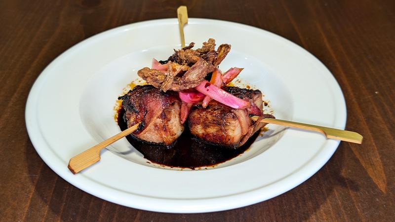 1837 red ale braised pork belly squares wrapped in double smoked bacon served crispy, tobacco onions, pickled red onions, apple cider balsamic glaze