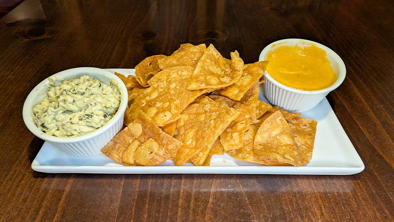 choice of (2) dips: smoked gouda with roasted garlic & spinach or whipped feta garnished with cucumbers and fresh lemon, or 1837 beer cheese dip. accompanied by seasoned tortilla chips.