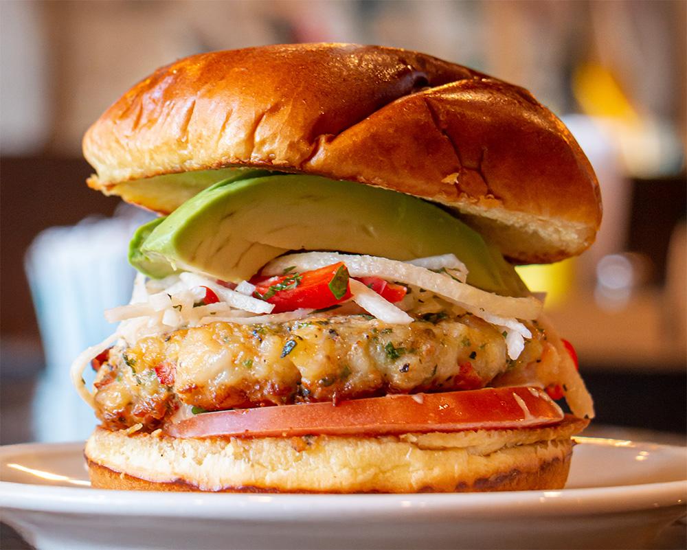 spicy shrimp burger, jicama slaw, avocado, tomato + chili lime crema