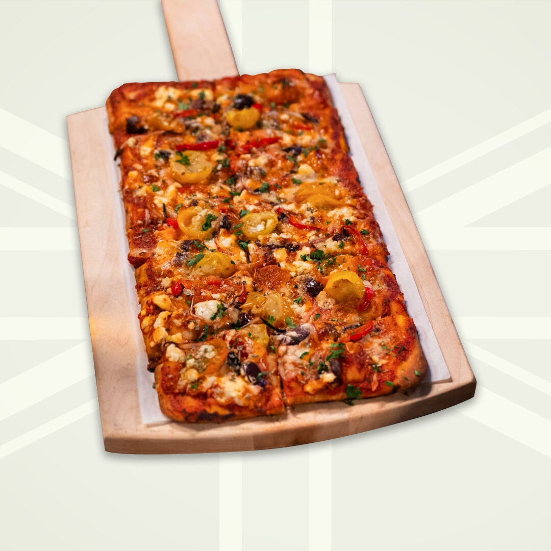 flatbread brushed with garlic butter & baked with tomato sauce, garlic marinated tomatoes, mixed cheese, feta, onion, red bell peppers & kalamata olives.